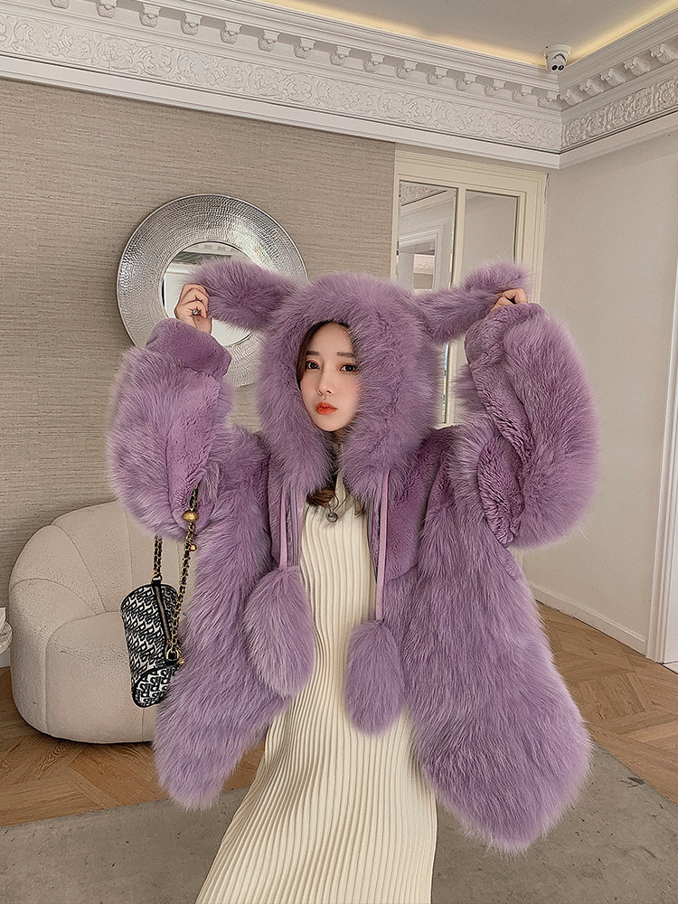 "Drunken Rabbit" imported fox fur splicing otter rabbit hood fur coat young winter girl