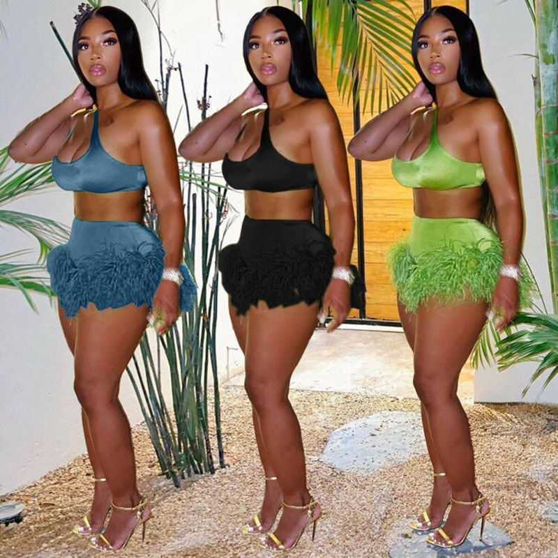 Echoine Solid Feather Fringe Shorts Crop Top Two Piece Set Summer Streetwear Women Sexy Bodycon Tracksuit Party Outfits