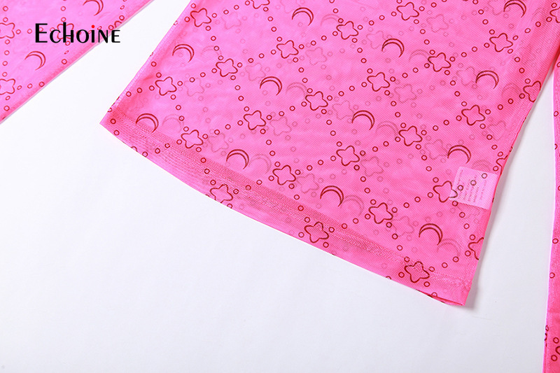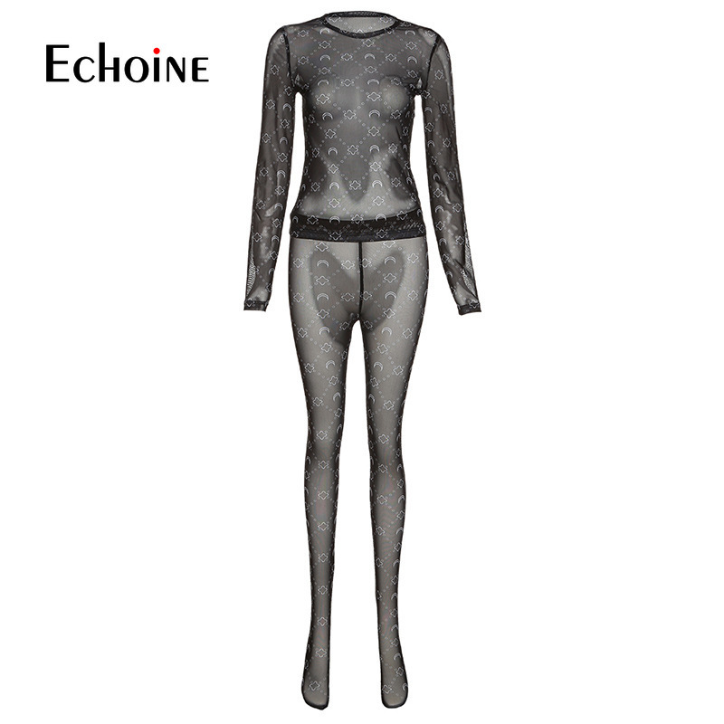 Echoine Summer Women Mesh See Through Print Two Piece Set Long Sleeve Top + High Waist Trousers Sexy Party Nightclub Outfits