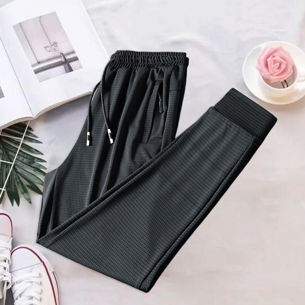 Elastic Waist Drawstring Zipper Pockets Jogger Pants Breathable Mesh Solid Color Long Pants Male Clothing
