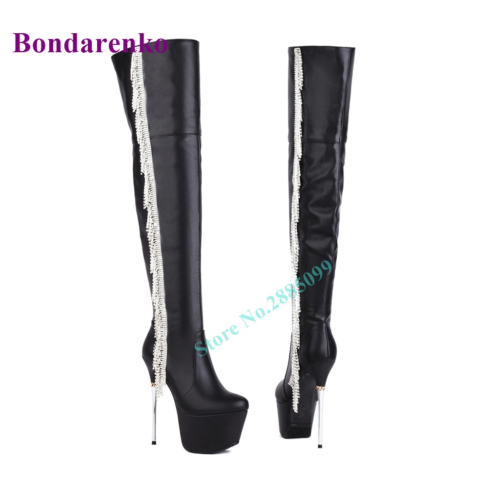 Fringe Platform Stiletto Heel Boots Over The Knee Side Zipper Crystal Leather Boots Women Shoe Autume Winter Party Dress Boots