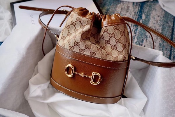 Gucci 1955 Horsebit Bucket Bag In GG canvas With Brown Calfskin