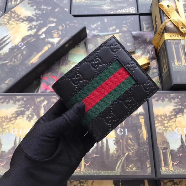 A combination of two of Gucci’s most recognizable icons: the GG motif and the Web. This bi-fold wallet is made in heat debossed Gucci Signature with Gucci Web stripe detail.