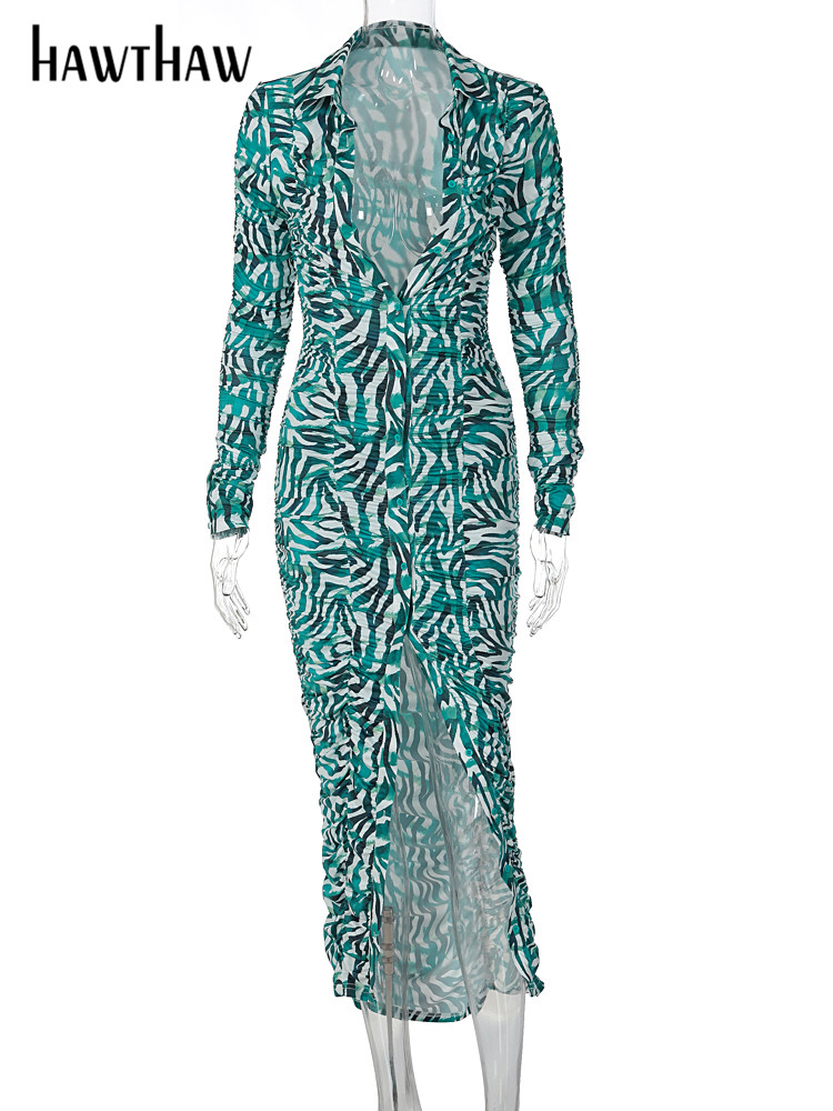 Hawthaw Women Elegant Long Sleeve Printed Bodycon Streetwear Green Midi Dress Autumn Clothes WholeItems For Business