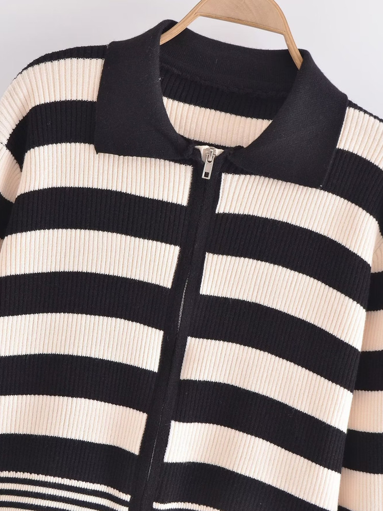 PUWD Women Lapel Patchwrok Striped Sweater 2022 Autumn Winter Fashion Girls Casual Female Long Sleeve Zipper Cardigan Sweater