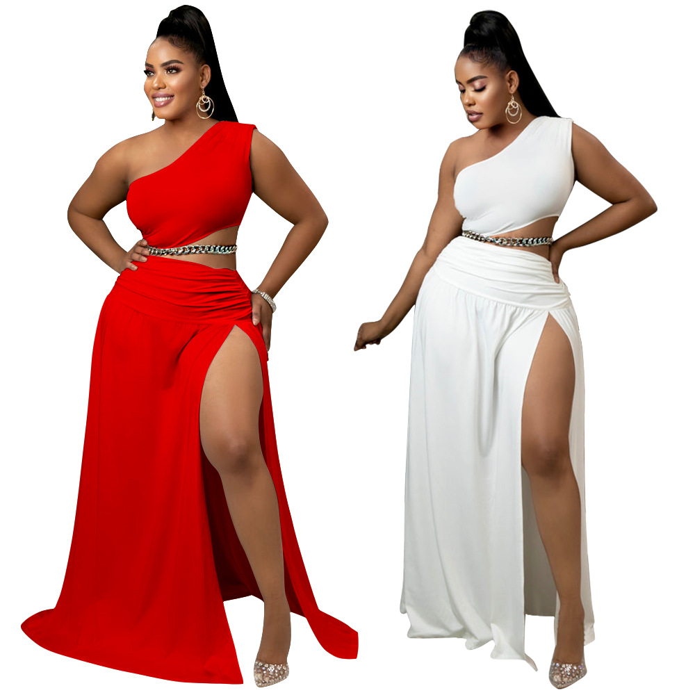Plus Size Two Piece Sets Solid Color Sloping Shoulder Strapless Sexy Tight Slit Elegant Two-piece Suit WholeDropshipping