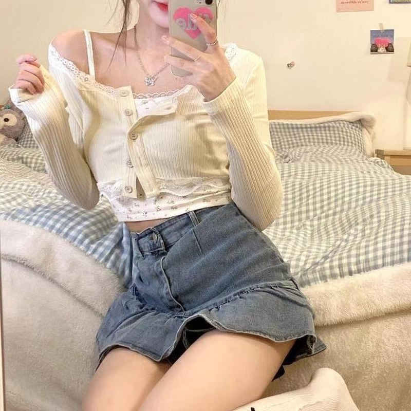 Sets Women Fresh Chic Summer Female Two Piece Single Breasted Cardigan Sexy Girlish Crops Camisole Tender Streetwear Holiday New