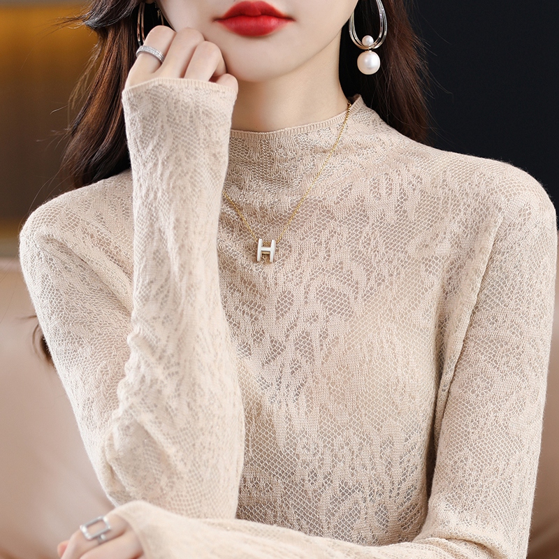 Spring and Autumn Three-dimensional Carved Half Turtleneck Lace Hollow Knitted Sweater Women's Pullover Sweater