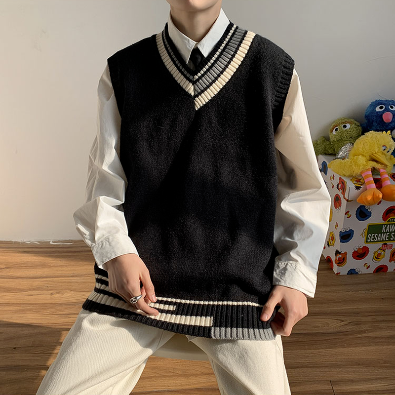 Striped V-neck Sweater Vests Men Loose Sleeveless Knitwear Male Preppy Style Autumn Warm Thermal Jumpers College Simple Baggy