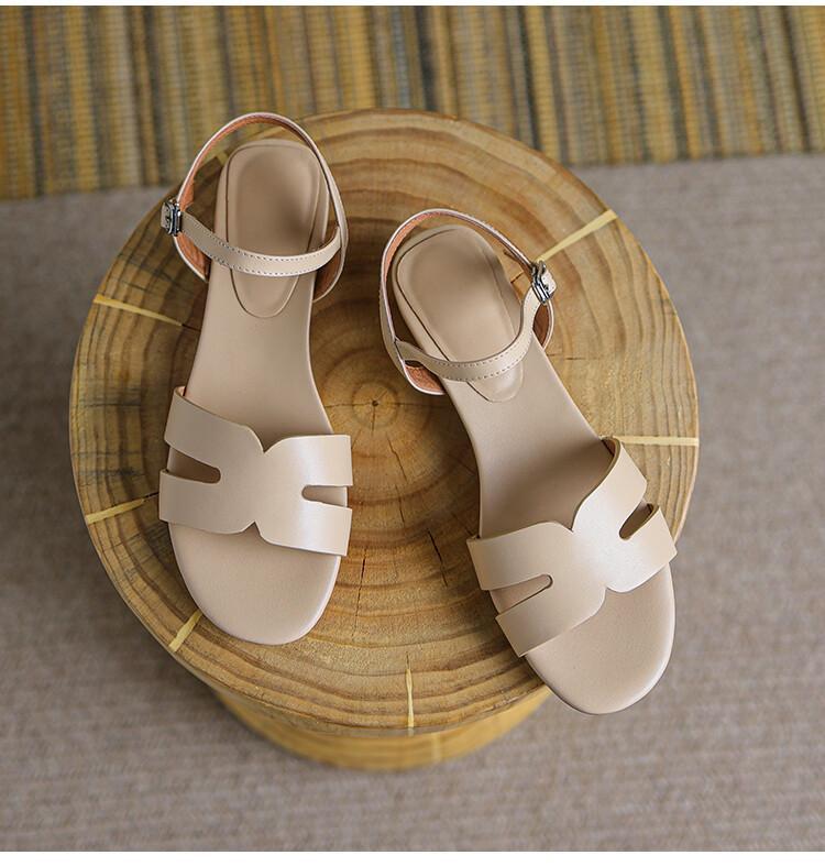 Summer Sandals Solid Color Cowhide Leather Hollow Low Heel Open Toe Strap Comfortable Ladies Sandals