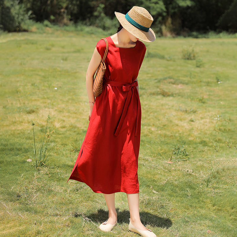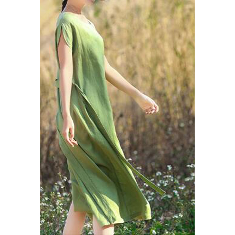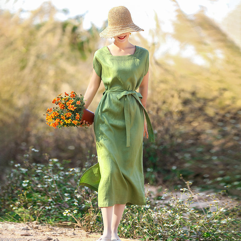 Summer Solid Cotton Linen Loose Casual Long Dress Short Sleeve Elegant Vestidos De Fiesta Aesthetic Chic Robe Femme