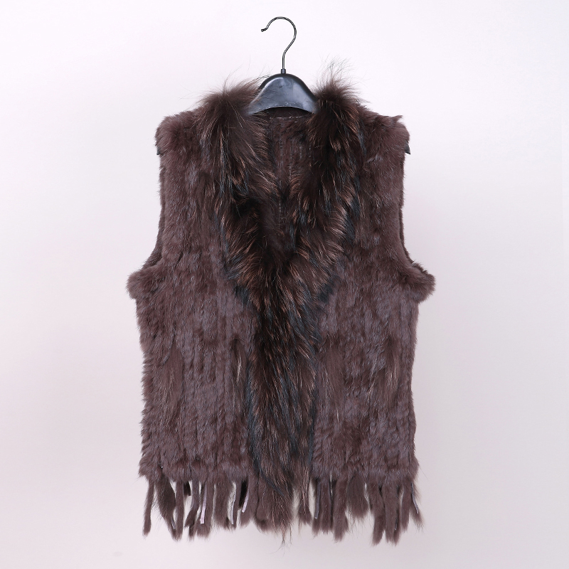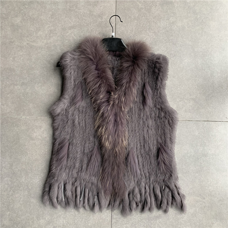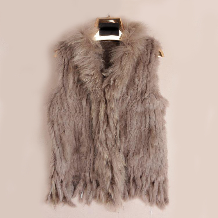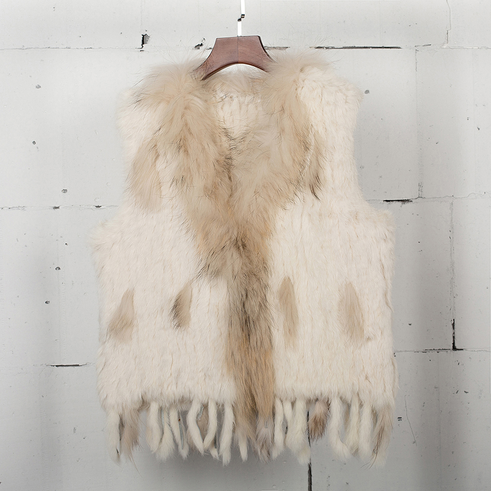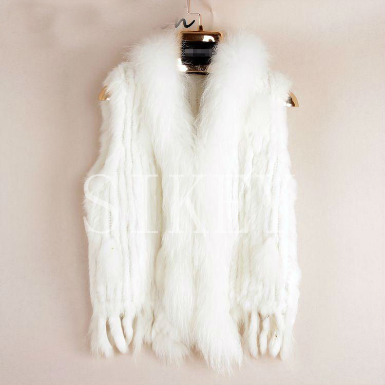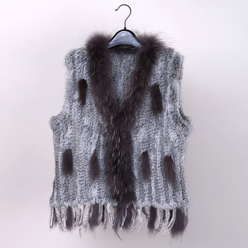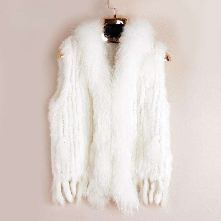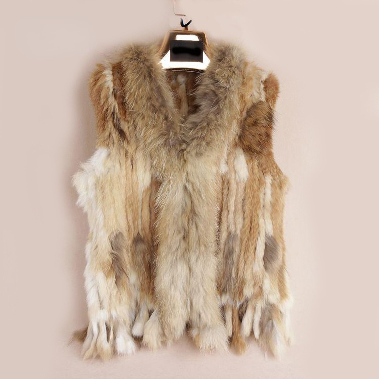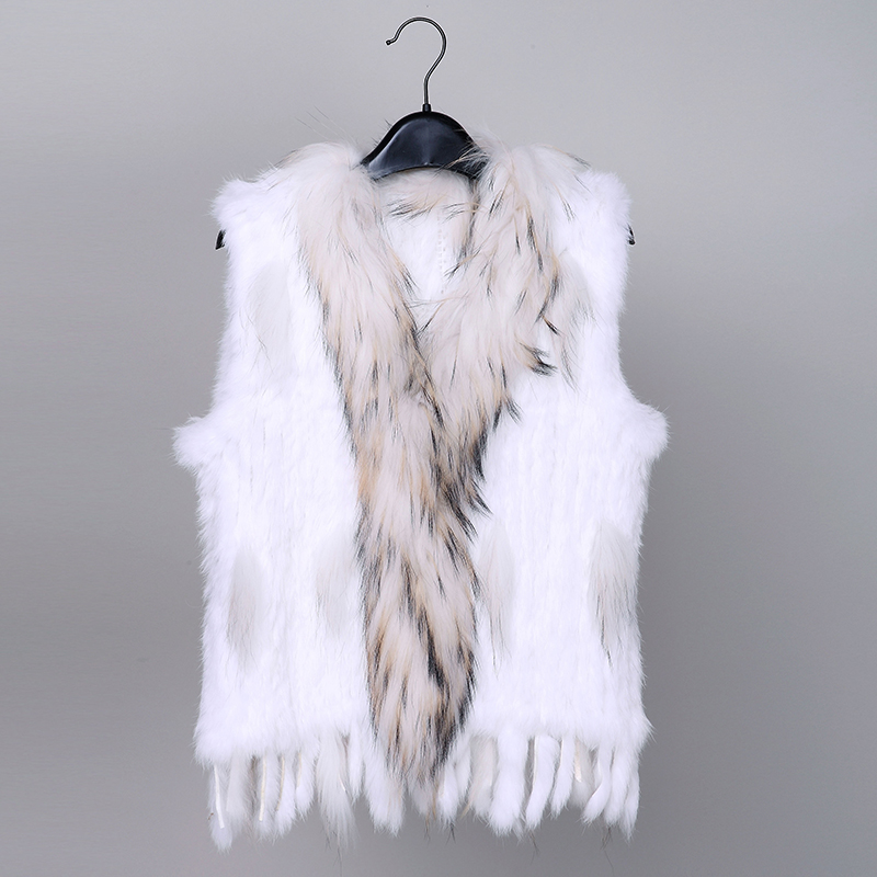 VR001 Free Shipping Womens Natural Real Rabbit Fur Vest With Raccoon Fur Collar Waistcoat/jackets Rex Rabbit Knitted Winter