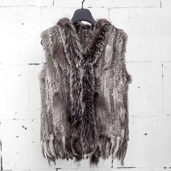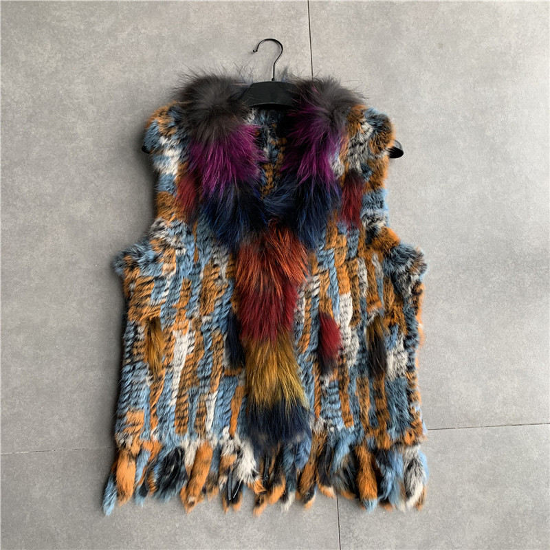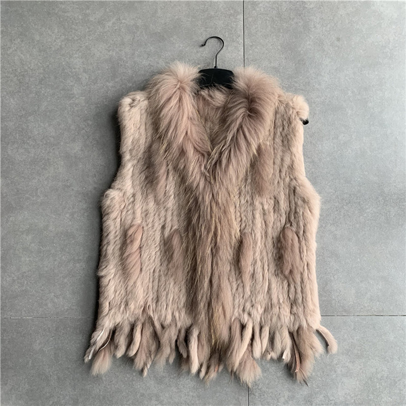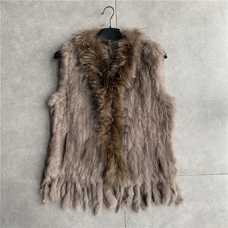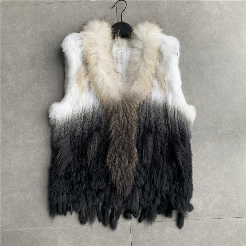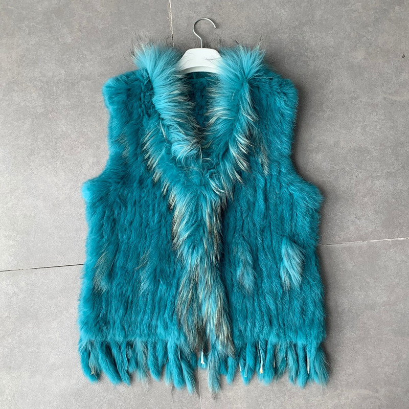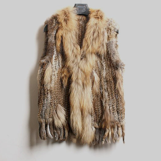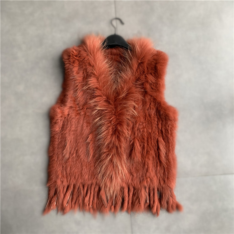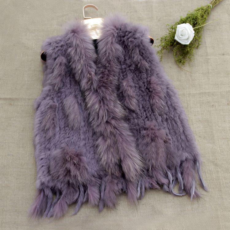 VR001 Free Shipping Womens Natural Real Rabbit Fur Vest With Raccoon Fur Collar Waistcoat/jackets Rex Rabbit Knitted Winter