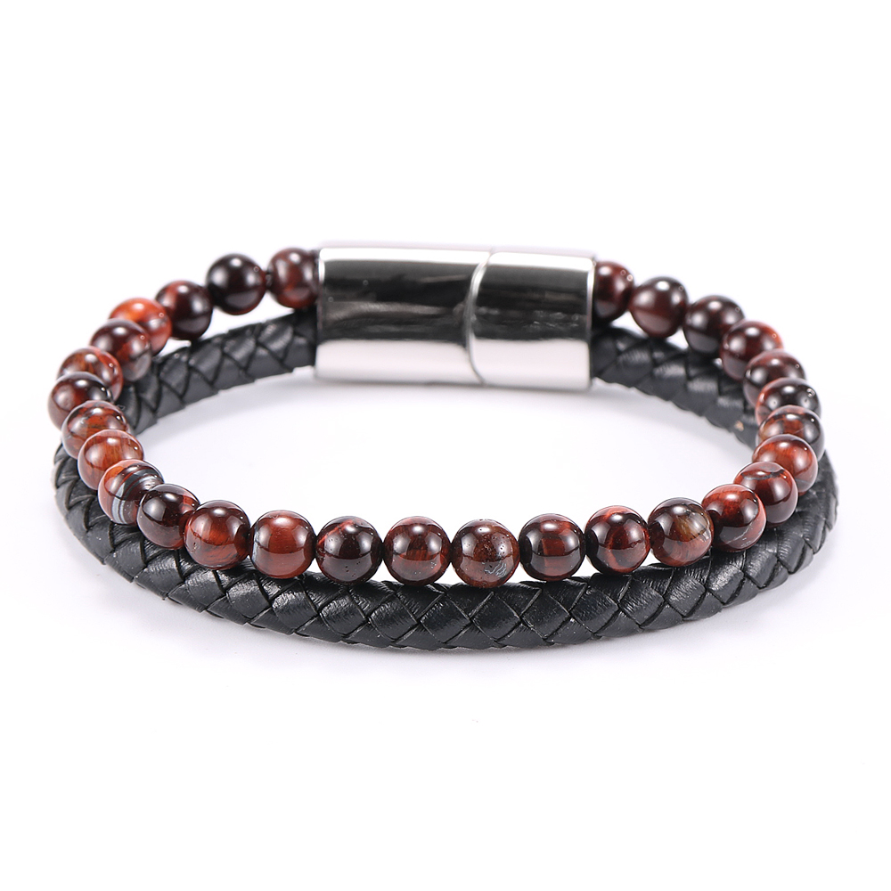 Item::Vintage Men's Jewelry Black Genuine Leather & Natural Stone Bead Bracelet Stainless Steel Magnetic Buckle Homme Wristband Bangle