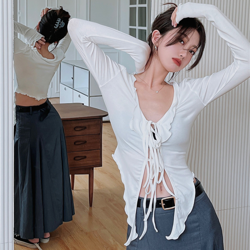 V-neck Sexy Hollow Lace-up Solid Color Long-sleeved T-shirt Women Summer Irregular Ruffled Casual Crop Tops