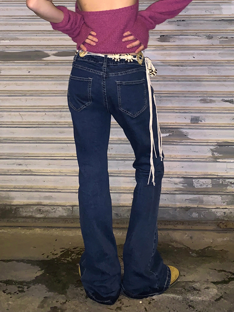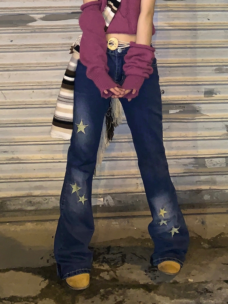Waatfaak Star Printed Streetwear Y2K Jeans Vintage Low Waist Pockets Blue Denim Skinny Flare Jeans Women Low Rise Grunge Retro