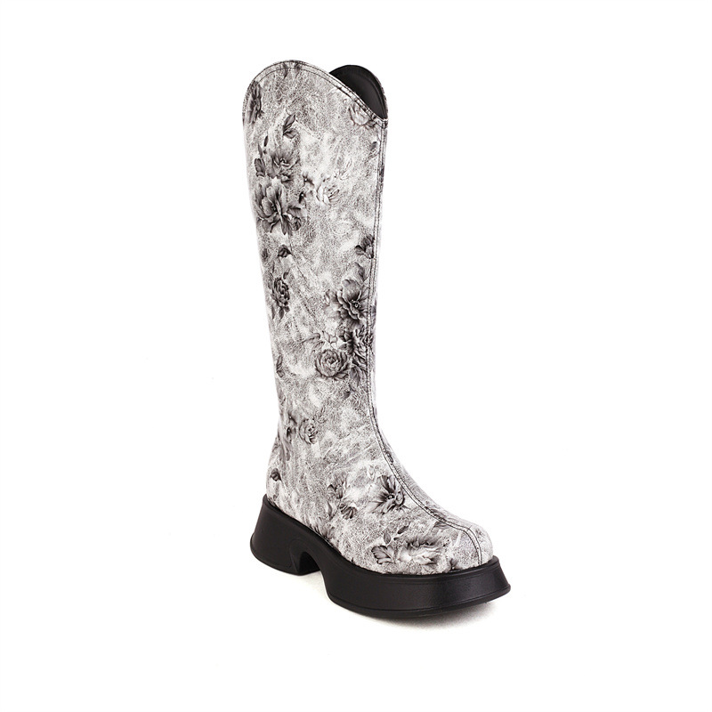 Women Boots 2022 Trend Luxury Winter Retro Round Head Small Platform Women Shoes Casual Mid Heel Print Ladies Knee High Boots
