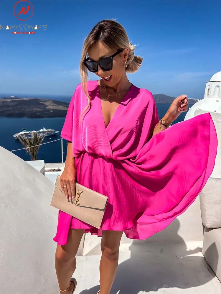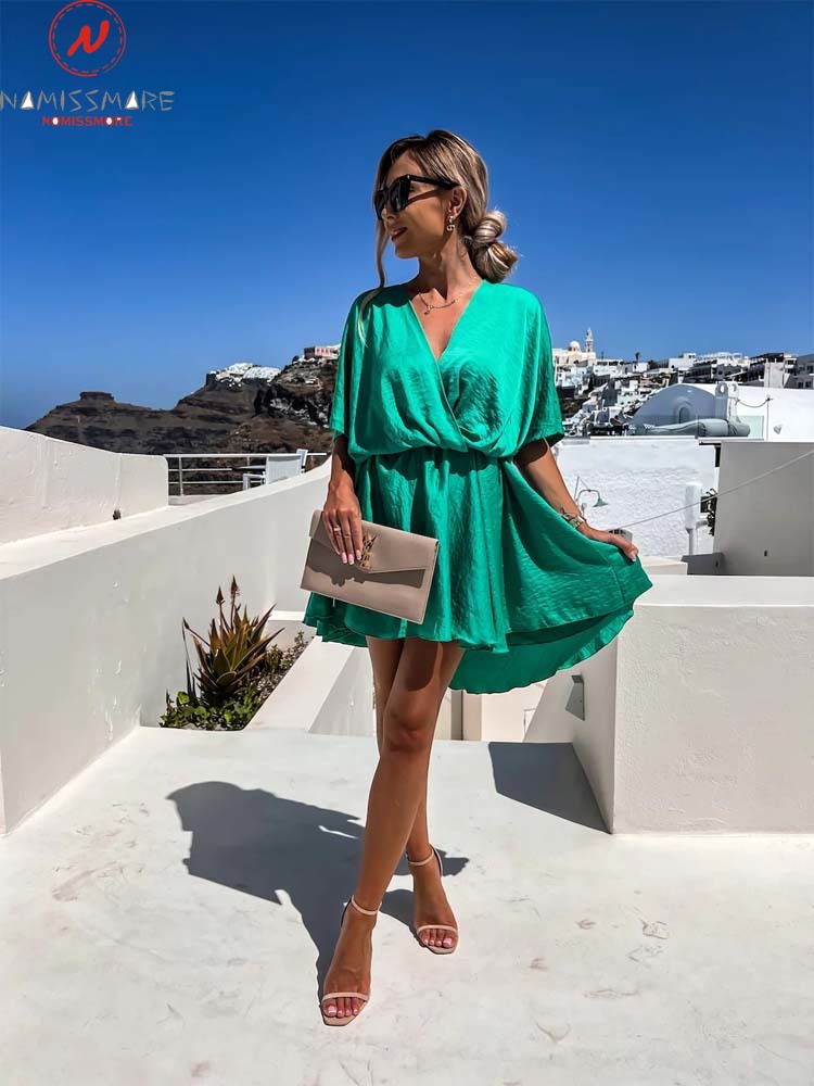 Women Summer Solid Color A-Line Dress Irregular Design V-Neck Half Sleeve Mid Waist Casual Loose Mini Dress
