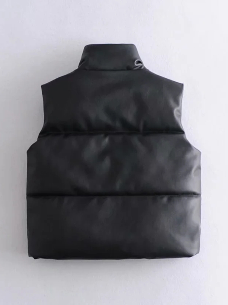 Womens Puffy Vest Down Vest Black Pu Leather Vest Woman Jacket Coat Autumn Winter Outwear Puffer Vest Female Sleeveless Jacket