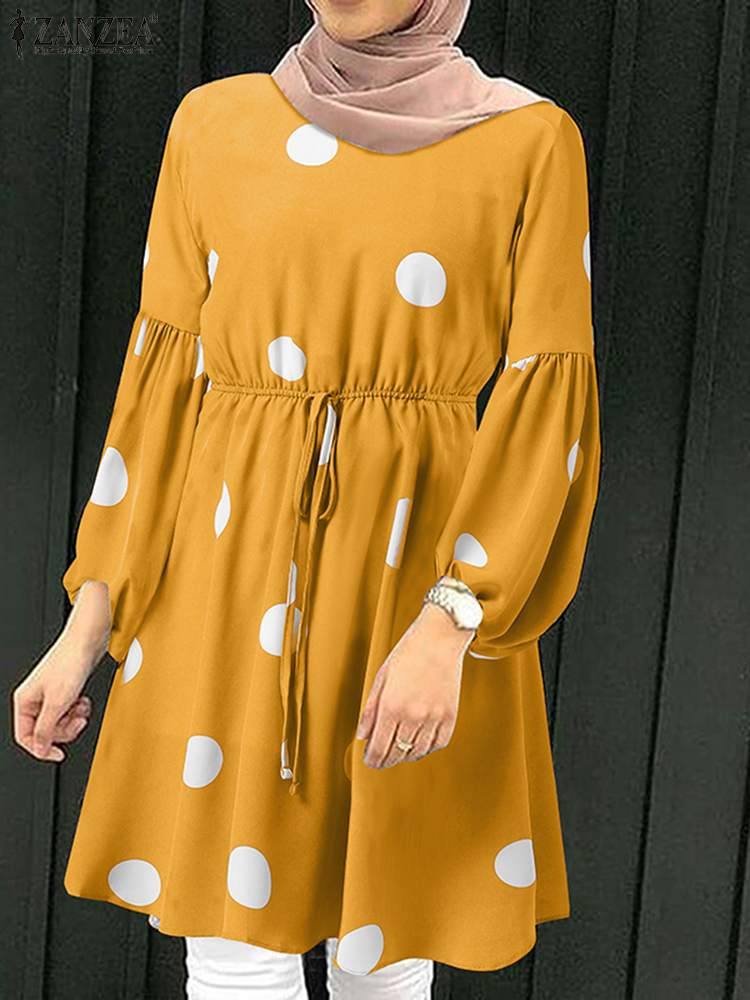 ZANZEA Lace-Up Puff Sleeve Islamic Clothing Women Polka Dots Printed Muslim Blouse Elagant Casual Dubai Marocain Turkish Tops