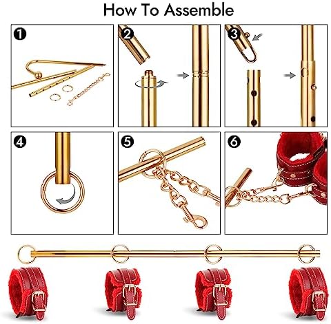1. Take out the 6 accessories of the steel pipe 2. Tighten the two steel pipes clockwise; 3. Press the steel ball to connect with the small circular hole; 4. Connect the circular ring to the small circular hole; 5. Circular ring connecting buckle; 6. Connect the handcuffs to use it;