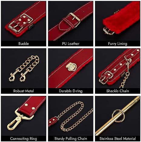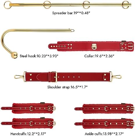 Overall, this is a fantastic value for all of the different pieces included.I have a few different sets that have wrist and ankle Cuffs, these are by far the most comfortable I have tried. This new line are a good bit bigger than their older black set, and can accommodate larger sizes. I would not reccomend this set if your partner is smaller. My wrist is 7.25 inches and fits very comfortably at the smallest hole. The last hole is 2.625 inches longer. Likewise, my ankle is 9.25 inches and fits in the smallest hole. There is similarly an additional 2.375 inches to the last hole.The leash is one of the most solid ones I have seen, all of the chains in this set have a significant weight to them, they are real metal, and quite beefy.The two chains that are for the restraints are easily long enough for me to put on and take off by myself. This is a critical feature for safety, since this is most likely going to be used by people with beginner to intermediate levels of experience. I have not been able to find a position that I could not get out of quickly if I needed to, though I have in no way exhausted the many configurations avalible within this set.The Spreader Bar screws apart in the middle to allow for easy storage which is a great feature. Each segment is about 9.5 inches long, for a total length of 19 inches. I am not sure what metal it made of, but it is stiff enough that you would need to really try to bend it. I don't think it would be impossible to bend, however I don't want to destroy it. It has a wall thickness of about 0.03 inches and is fairly light overall.The ball of the hook is 1 inch, so very reasonable for a beginner. It can either attach to the Spreader Bar with a spring pin, or be used with the collar and adjustable strap which is how I prefer. Having the Bar vertically up your back is very restrictive, and pulls my neck back a bit more than is comfortable, but YMMV. The Adjustable Strap has clips on either end which makes it extremely versatile. It could be used with different Collars or Hooks without issue, and it is very sturdy. There is a difference of 5.25 inches between the longest and shortest settings, which should allow for it to be used by a variety of bodies in many different positions.The Rings are hinged, and have a small knotch so they can't be easily pulled open sideways, though they seem like they would be the easiest part to break, if they were lined up in just the wrong way. I still think it would require a pretty significant force to do that though.All in, this is a very good set, especially for the cost. I really appreciate the quality, and attention to detail. I am looking forward to using this set, especially combining a few of the elements with other sets too.