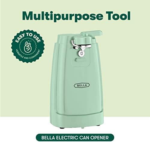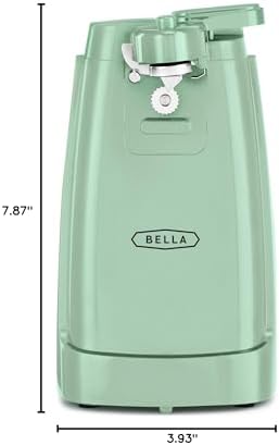 bellaelectric can opener with stanless steel blade, knife sharpener on back plus a cord storage.i chose the red.looks great on counter, does not take up alot of space.the plus?opens regular cans and has no problem opening larger cans !blade glides easily opening the can and detachable bladecomes outwith no problem for washing.good buy!