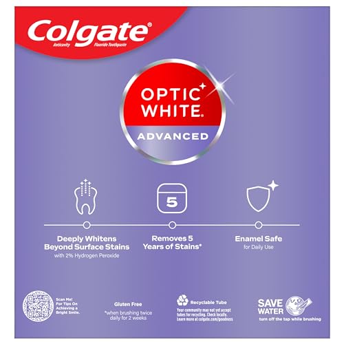 Colgate Optic White advanced teeth whitening toothpaste deeply whitens for up to 4 shades. It contains 2% Hydrogen Peroxide, a professionally recommended whitening ingredient proven to deeply whiten beyond surface stains. This vegan toothpaste is enamel safe and good for daily use. Plus, the fluoride toothpaste formula provides protection against cavities. Get a brighter, whiter, bolder smile with Colgate Optic White advanced teeth whitening toothpaste. When brushing twice daily for 6 weeks