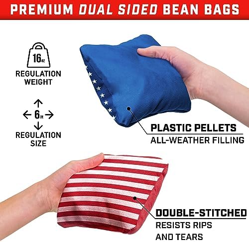 The GoSports Dual Sided Cornhole Bean Bags - Slide and Stop Regulation Tournament Bean Bags feel like good weighted bean bags for corn hole.The two sided bag has slide and stop which is great when you're an advanced player and can actually control your throws - lol (not in my world yet).The patriotic design is just what my husband wanted with red and white strips and blue and white stars.It's great on a plain surface cornhole board.Comes with heavier duty bag to store the beanbags in.