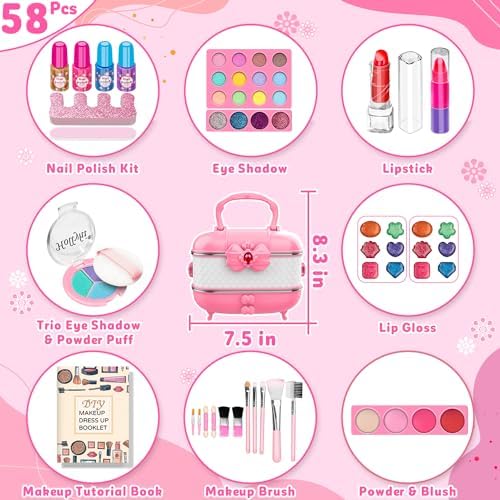 Has your little girl asked for her first makeup kit? Are you looking for a safe children's makeup kit for your child? We have prepared the makeup set with various colors and tools for you, containing almost all needed for makeup. Explore the endless pleasures of beauty with your little princess!