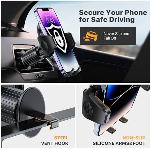 I like this phone holder a lot. I needed something that has a wide and tall grip and won't let go of the phone. This holder was very easy to install with an adjustable metal hook that attaches to the back of a vent blade. Once attached tightly it will not let go. It grips very strongly with the base tightened against at least 3 blades which forms a very stable base. The .8" tall side grips were just what I needed since my phone with its protective case and other items is about .7" thick. My phone and case is also about 3.5" wide, so the 4.2 " opening works fine. Once the phone is placed in holder just push the grips toward the phone tightly. I was able to locate it perfectly between my car power button and center display so I can still see everything clearly. I love its location. Its very easy to reach and I don't need to take my eyes off the road. With an easy to install ball above the hook adjustment knob, it just pops into the back of the holder and then you can tighten it to your preference.It has a universal 360 deg swivel around and can swivel about 60. deg. backwards and forwards. Just push an easy to get to button on the back and the grips open slow and smoothly.The holder does not really block the vent that much since it is held about 3" above the vent. I still feel a lot of air coming from that vent. I really don't have any other place to mount a phone holder without interfering with something and I don't like mounting on the windshield or dashtop. This holder will not block any view through the windshield. It was only $11 and seems really well built and holds the phone stably without any real vibrations. I am not worried about the phone falling out of the holder.