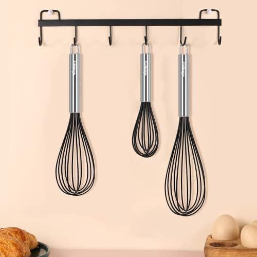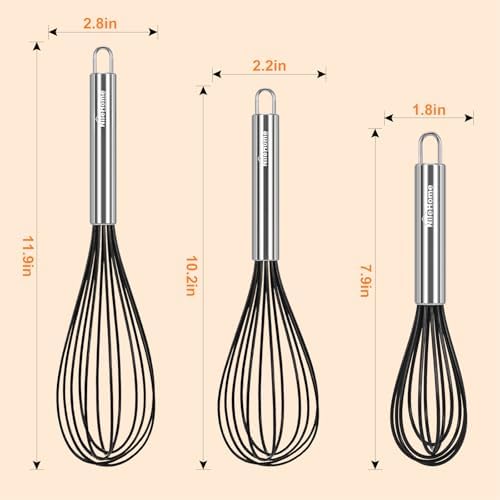 NileHome Whisk Commercial Whisks Stainless Steel & Silicone Non-Stick Coated Small Whisk Set 8" 10" 12" Kitchen Wisk Wire Whisks for Cooking 3 Pack, Black