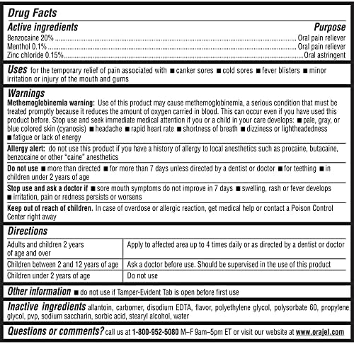 Orajel 3X Medicated For All Mouth Sores Gel provides instant relief from mouth sore pain including: canker sores, cold sores and gum irritation, as well as cheek bites and irritation from dentures or braces. The formula combines the power of three active ingredients for fast topical pain relief, right where you need it most.