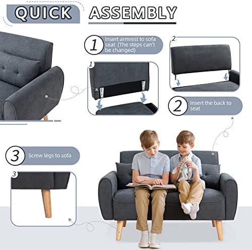Awesome little couch. It can fit one full size adult comfortably. I can sit on it together with my daughter too but the max weight limit is not too much so be careful. The size is much more like an oversized chair that is a bit low to the ground.The product comes exactly as shown with all the pieces needed to put it together. Very easy to put it together for the most part. It took about 15 minutes to attach the legs and one of the arm rests. Other armrest is already attached. Many people are saying the back is not sturdy and this is because of the way the pieces come to attach the back. You will need to do a lot of puzzle work to fit the back pieces together but once you do the back IS perfectly sturdy. Otherwise, if you don't want to spend time doing that it will sit comfortably against a wall as well.Couch is very well made and comfortable. Does not feel cheap at all. A little less cushion in the back rest than the seat but still comfortable. If you need a small seating in your house, this is a good choice!